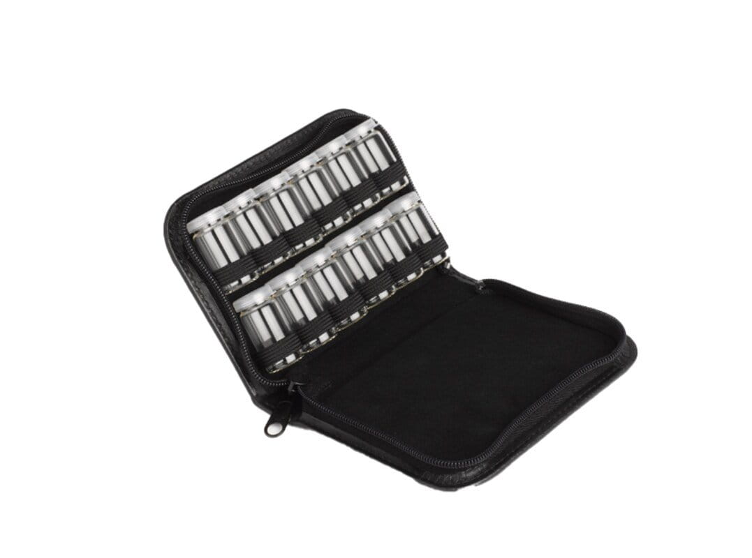 Reiseapotheke für Tablettengläser in schwarzem Rindleder  Ø 19 x 40 mm für Schüßlersalze, Tabletten, Globuli oder Flüssigkeiten. für 12 Gläser. (passend für Tablettengläser 5g/ml Ø19x40mm)
