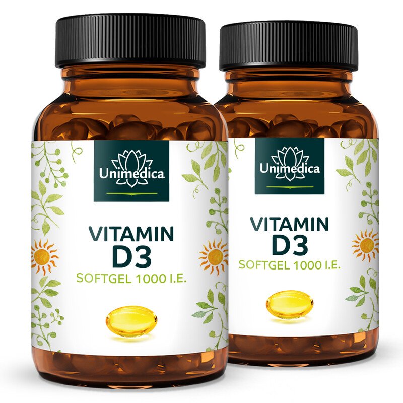 2er-Sparset: Vitamin D3 Softgel  - 25 µg (1.000 I.E.) pro Tagesdosis (1 Kapsel) - 2 x 365 Kapseln - von Unimedica