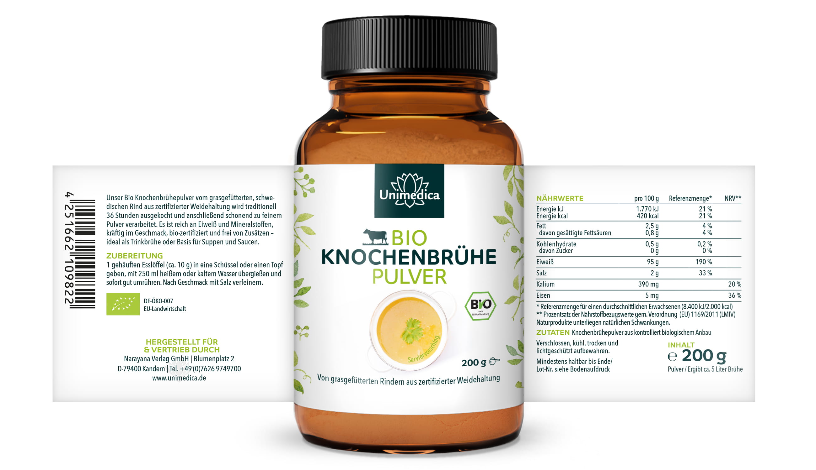 Jedes Glas Bio Knochenbrühe-Pulver von Unimedica enthält 200 g Brühe-Pulver. Daraus können ca. 5 Liter Brühe hergestellt werden.