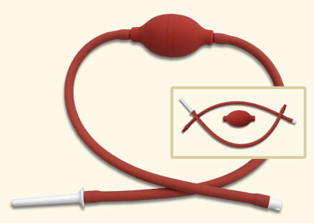 Der Klyso (Klistierpumpe) besteht aus einem starken Pumpball mit 2 Schlauchansätzen, Rückschlagventil, Ansaugventil und Klistierrohr. Länge: 120 cm. Länge Klistierrohr: 7 cm
