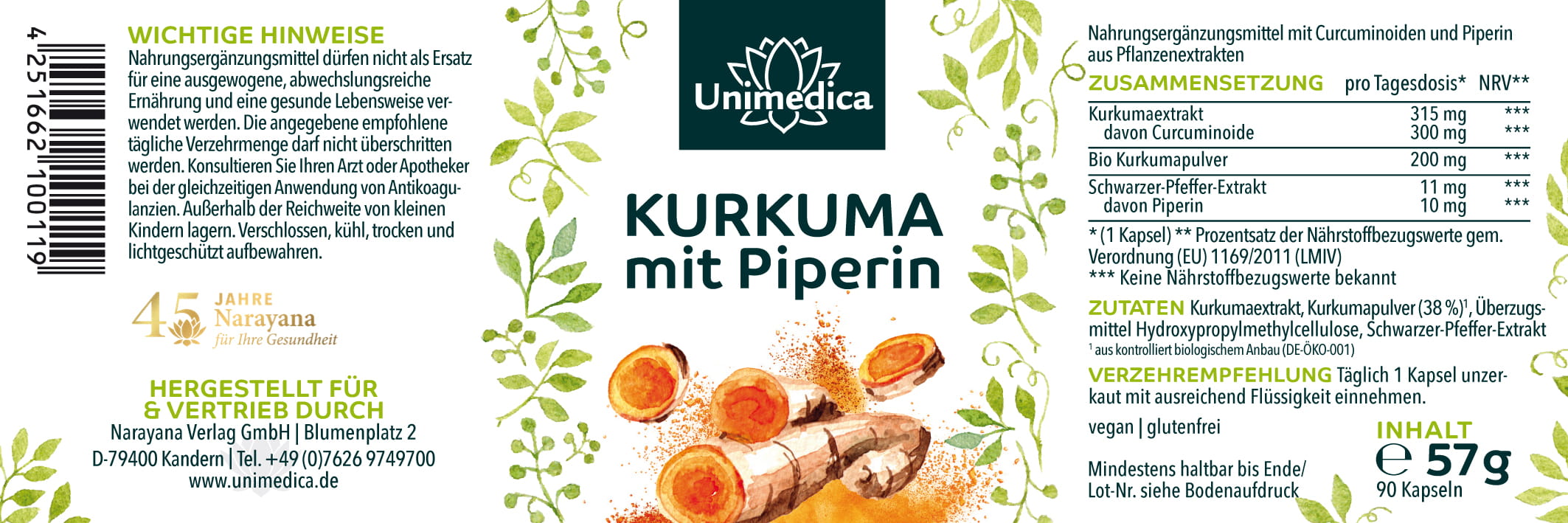 30980Die Kurkuma mit Piperin-Kapseln von Unimedica sind mit 315 mg Curcumaextrakt (davon 300 mg Curcuminoide und 200 mg Curcumapulver) pro Kapsel hochdosiert. In der traditionellen ayurvedischen Medizin wird Kurkuma seit über 5000 Jahren als Gewürz und Heilpflanze eingesetzt. Für eine optimale Bioverfügbarkeit und zur zusätzlichen Aufwertung des Nährstoffprofils enthält jede unserer Kurkuma mit Piperin-Kapseln außerdem 10 mg Piperin aus 11 mg Schwarzer-Pfeffer-Extrakt. Ein Glas (90 Kapseln) entspricht einem 3-Monats-Vorrat.