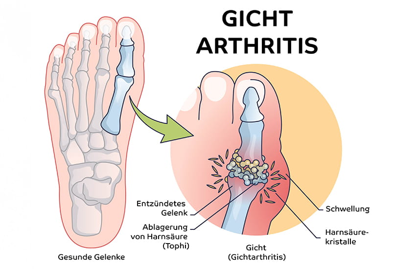 Abbildung 2: Darstellung eines entzündeten Gelenks mit Schwellung und Ablagerungen von Harnsäurekristallen (Tophi) im Vergleich zu einem gesunden Gelenk.